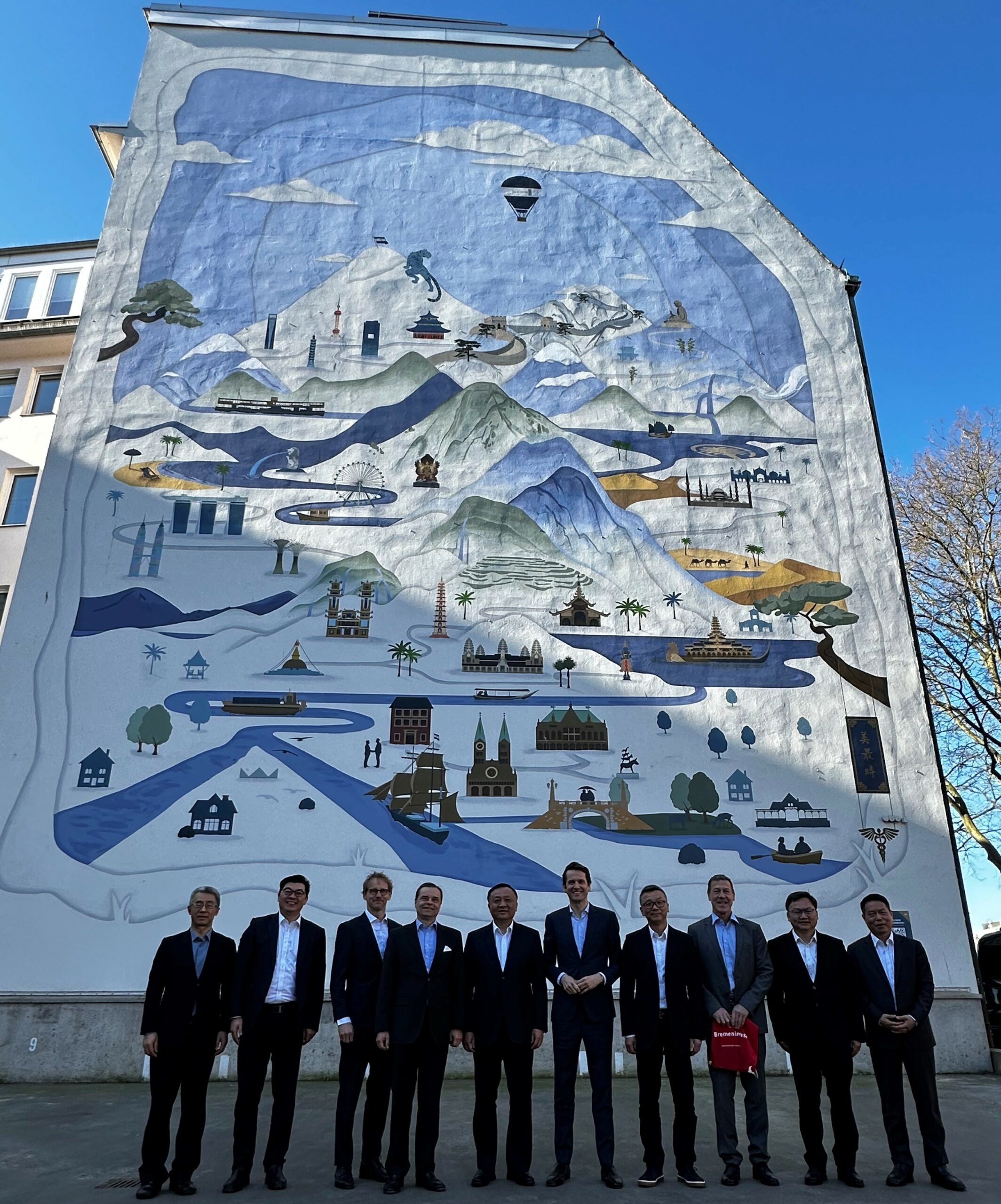 Vice Mayor Hua Yuan’s delegation and Melchers Group board members pose with the Great Wall mural at the Bremen HQ